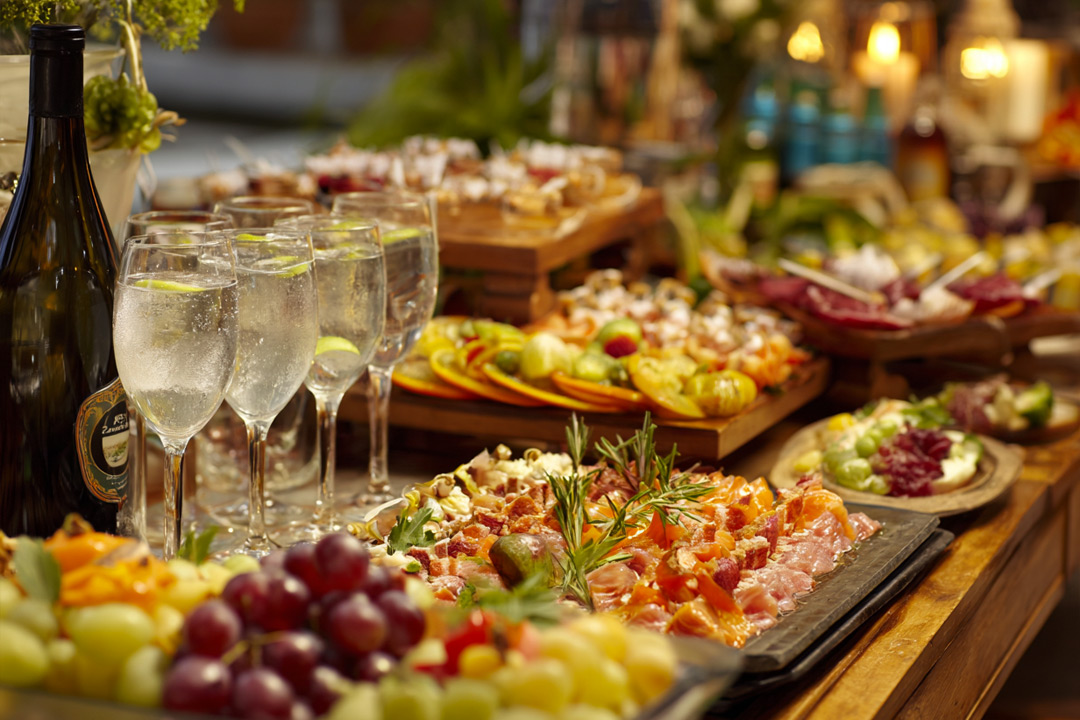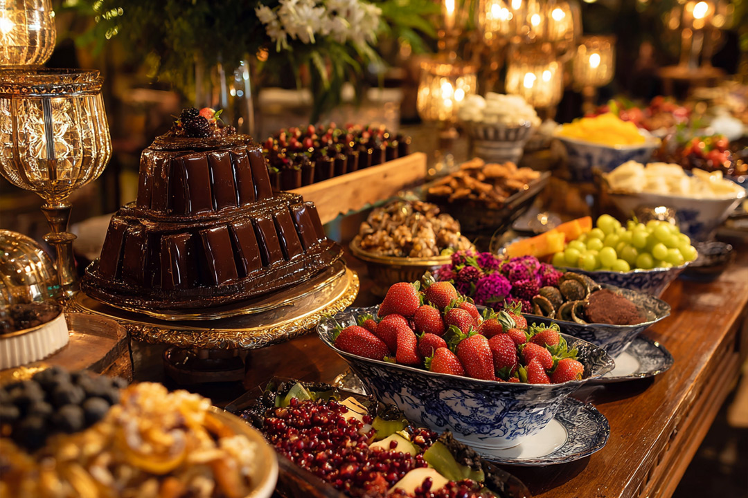 Mesa de doces, frutas e bolo dos 27 anos da Pousada.